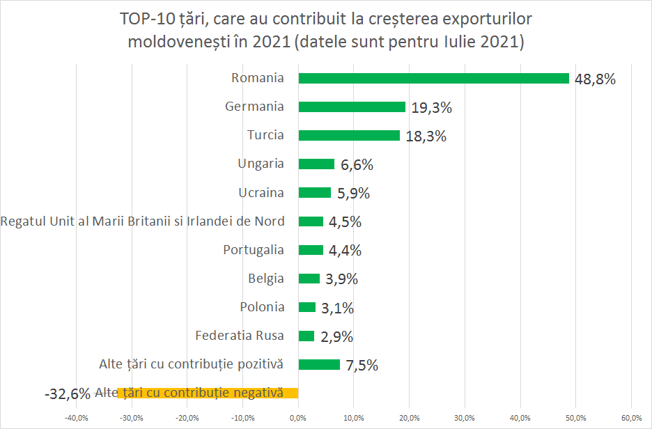 „De fapt, în mare parte, datorită țărilor din UE, Moldova a reușit în acest an să-și recupereze exporturile. Contribuția țărilor din afara UE este destul de modestă”, observă Ioniță.