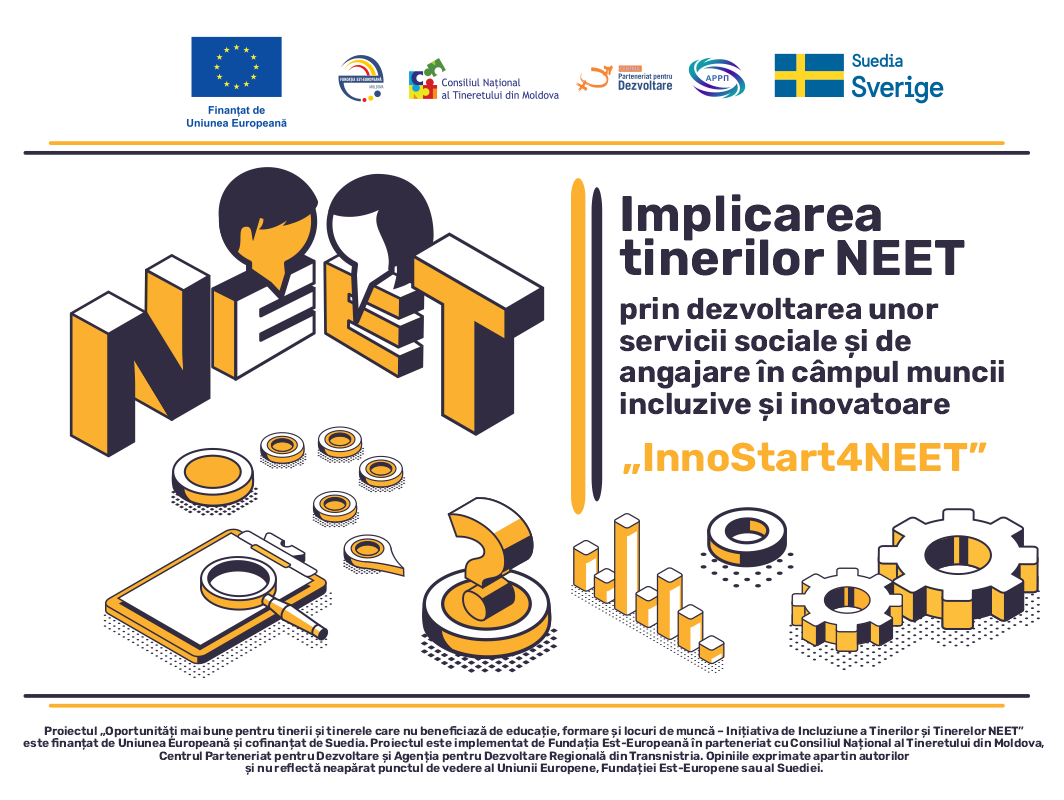 Proiectul „Oportunități mai bune pentru tinerii și tinerele care nu beneficiază de educație, formare și locuri de muncă – Inițiativa de Incluziune a Tinerilor și Tinerelor NEET” este finanțat de Uniunea Europeană și cofinanțat de Suedia. Proiectul este implementat de Fundația Est-Europeană în parteneriat cu Consiliul Național al Tineretului din Moldova, Centrul Parteneriat pentru Dezvoltare și Agenția pentru Dezvoltare Regională din Transnistria. Opiniile exprimate aparțin autorilor și nu reflectă neapărat punctul de vedere al Uniunii Europene, al Fundației Est-Europene sau al Suediei.