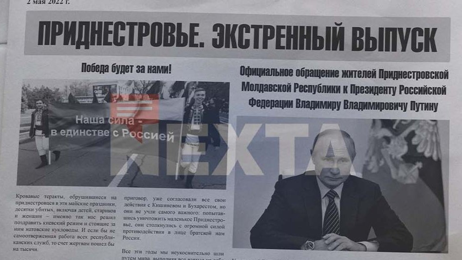 Canalul de Telegram NEXTA Live, care are în jur de 2 mil. de abonați, a publicat azi copia ziarului „Pridnestrovie. Extrenîi vâpusk” („Transnistria. Ediție specială”), datat cu 2 mai. Redactorul-șef al ziarului real de la Tiraspol a declarat că respectiva copie este „un fals evident”.