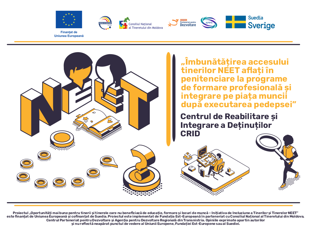 Centrul de Reabilitare și Integrare a Deținuților CRID este beneficiar al Programului de granturi destinat organizațiilor societății civile locale care contribuie la incluziunea tinerilor NEET prin pilotarea serviciilor incluzive inovatoare sau prin monitorizarea serviciilor pentru tineret care există deja.