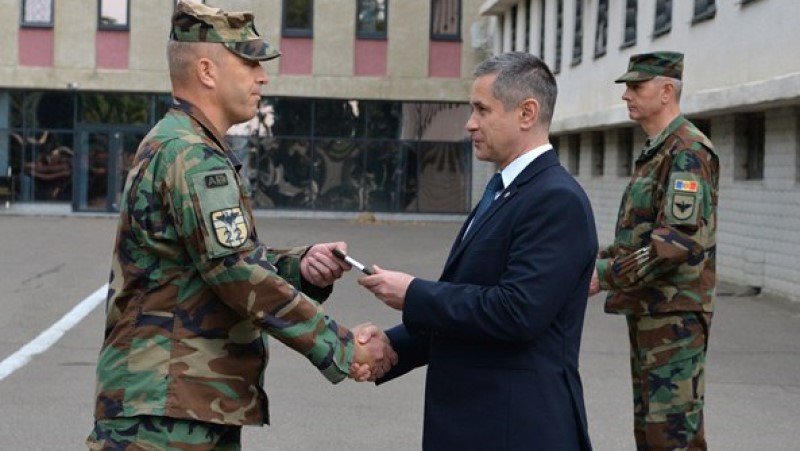 Ministrul Apărării Anatolie Nosatîi a înmânat epoleții de tip nou sergentului principal al Armatei Naționale, sergent major Andrei Cojocaru.