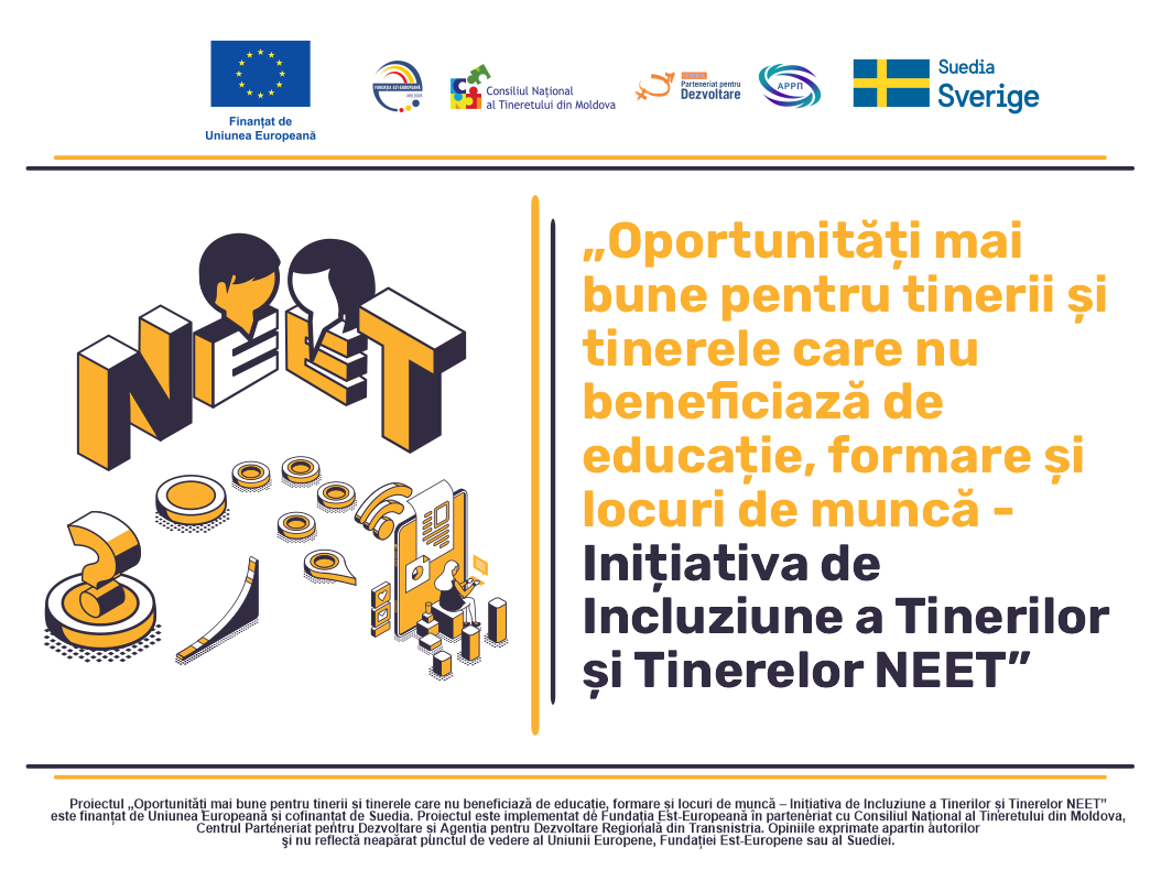 Proiectul „Oportunități mai bune pentru tinerii și tinerele care nu beneficiază de educație, formare și locuri de muncă (Inițiativa de Incluziune a Tinerilor și Tinerelor NEET)” este finanțat de Uniunea Europeană și Suedia. Proiectul este implementat de Fundația Est-Europeană în parteneriat cu Consiliul Național al Tineretului din Moldova, Centrul Parteneriat pentru Dezvoltare și Agenția pentru Dezvoltare Regională din Transnistria. Opiniile exprimate aparțin autorilor și nu reflectă neapărat punctul de vedere al Fundației Est-Europene, al Consiliului Național al Tineretului din Moldova, Centrului Parteneriat pentru Dezvoltare și al Agenției pentru Dezvoltare Regională din Transnistria, ale Uniunii Europene și/sau al Suediei.