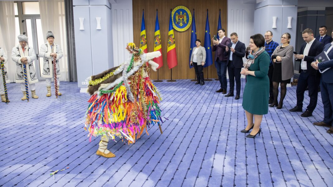 Și „Mocănașii” din Slobozia Mare, raionul Cahul, au venit cu o colindă autentică, culeasă din bătrâni, cu o urătură de la sudul țării și cu binecunoscutul obicei – dansul Caprei. La un moment, Natalia Gavrilița i-a ținut hangul Caprei în iureșul dansului, după cum se vede din imaginile video ale Guvernului.