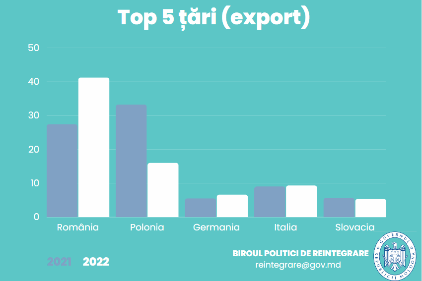 Principalele cinci țări din UE cu care au loc peste 80% din schimburile comerciale ale companiilor din regiune (import/export) sunt: România, Polonia, Italia, Germania și Slovacia, informează Biroul politici reintegrare.