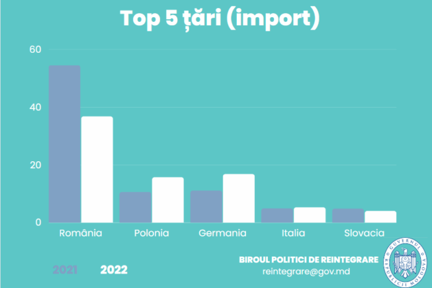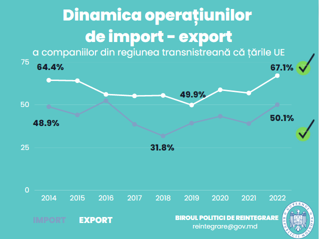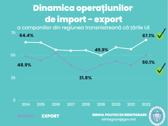 La fel, s-a înregistrat o avansare cu 4,4% a ponderii importului de mărfuri din UE în regiunea transnistreană, de la 45,7% în 2021 la 50,1% în 2022.