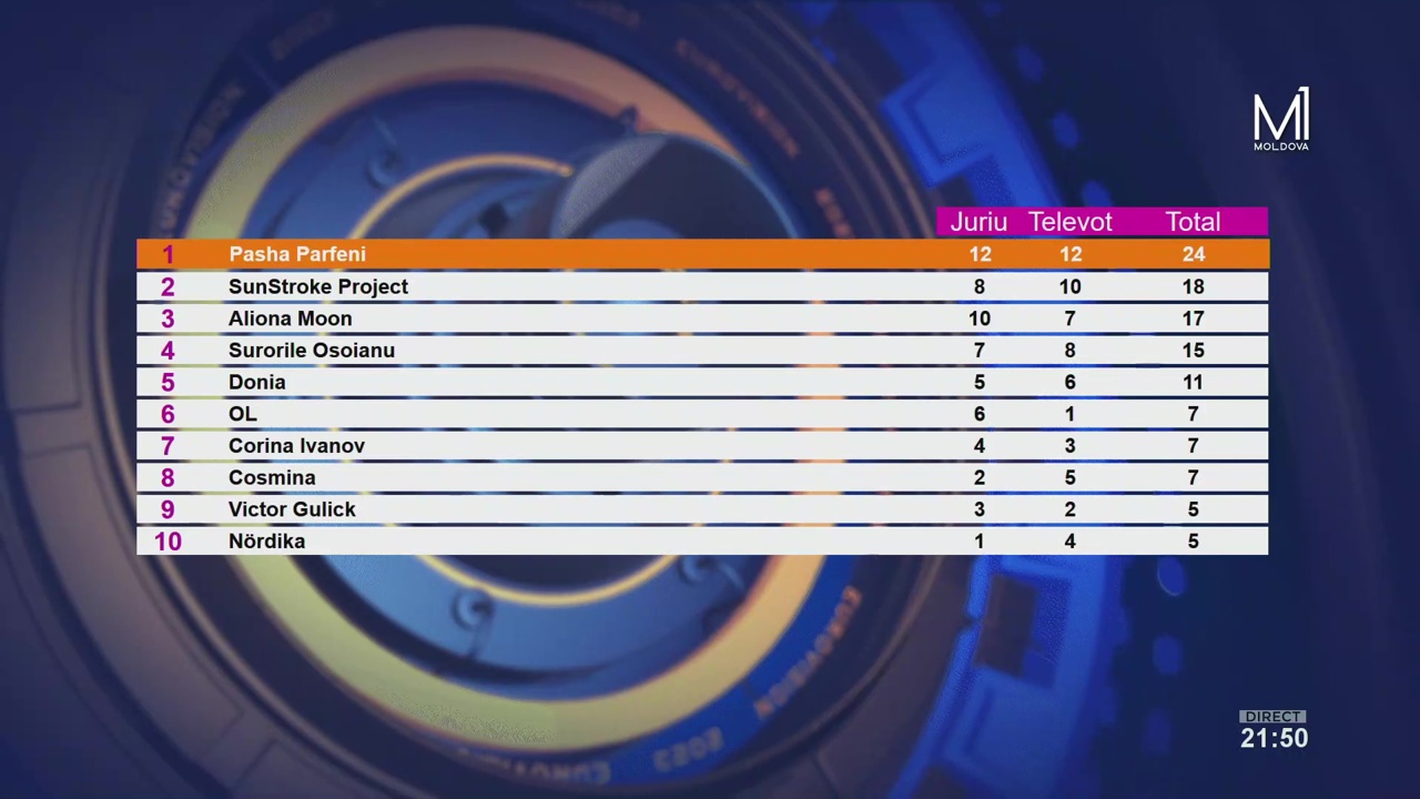 Pasha Parfeni a acumulat punctajul maxim din partea juriului și al publicului, în total 24 de puncte. Pe locul doi s-a plasat SunStroke Project cu 18 puncte, iar pe trei Aliona Moon – cu 17 puncte. În Parfeni Finala națională au participat zece interpreți.