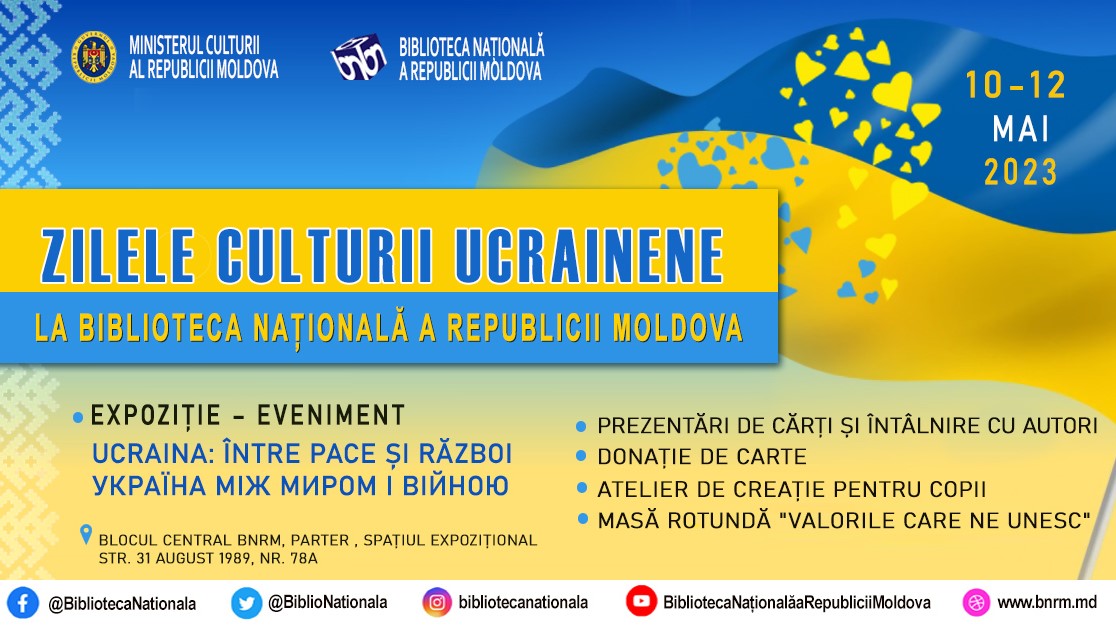 Biblioteca Națională a R. Moldova va desfășura, în perioada 10-12 mai, Zilele Culturii Ucrainene la Biblioteca Națională a Republicii Moldova.