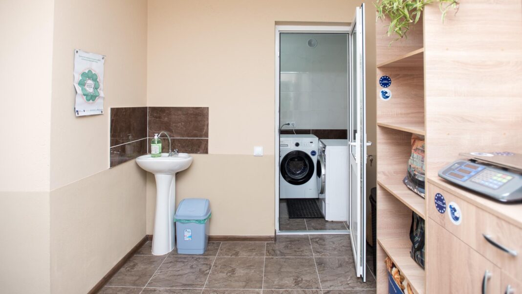 Spațiul oferit de către primărie a fost renovat, modernizat și dotat cu echipamente necesare: mașini de spălat și uscat rufele, fier și masă de călcat.