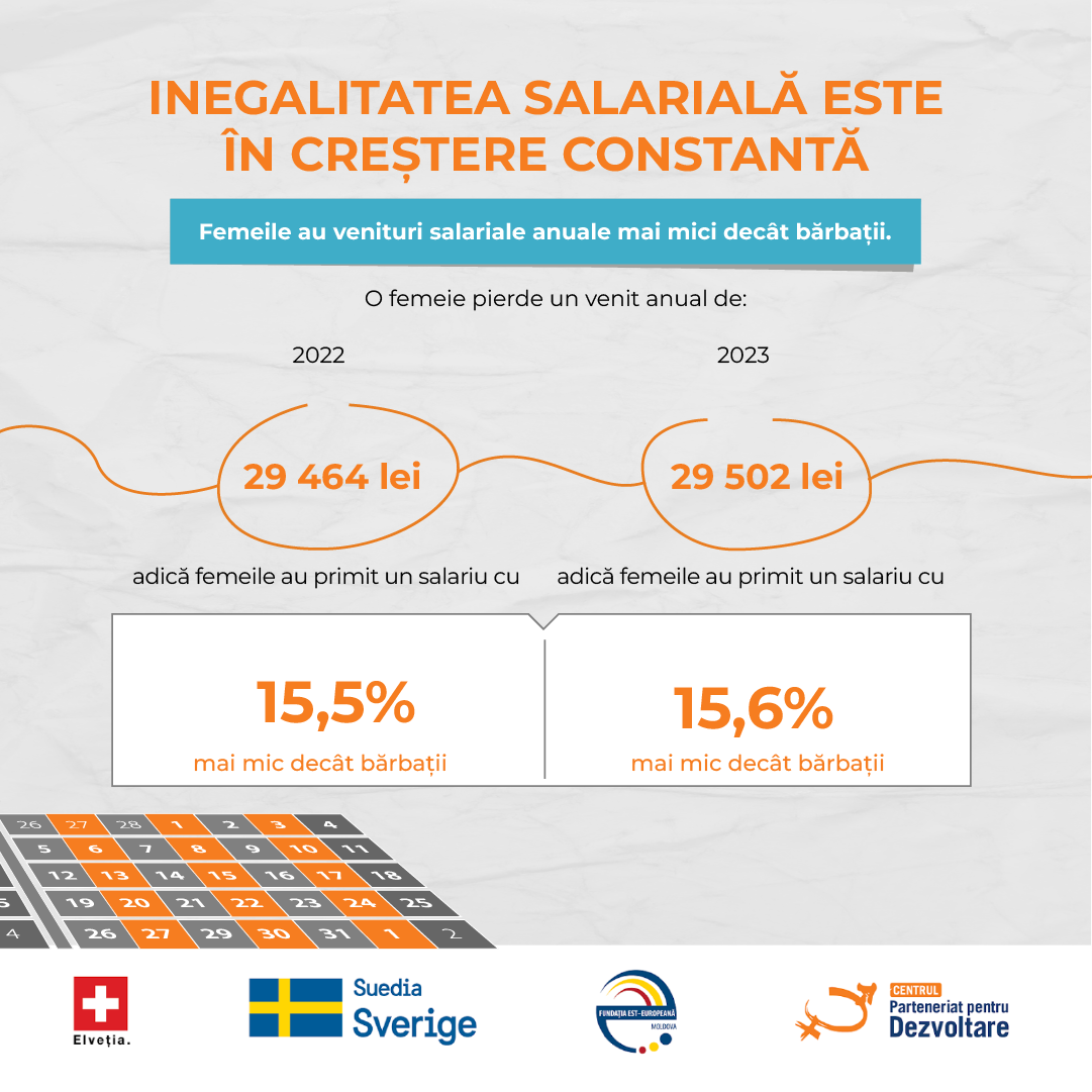 Conform calculelor pentru anul 2025 o femeie trebuie să lucreze până la data de 27 februarie pentru a atinge valoarea câștigului salarial al unui bărbat în anul precedent. În termeni monetari, pierderea financiară anuală a femeilor a atins valoarea de 29 502 lei în 2023, adică femeile au primit cu 15,6% mai puțin decât bărbații, potrivit Centrului Parteneriat pentru Dezvoltare, care a publicat o nota analitică în contextul Zilei Egalității Salariale în Moldova.