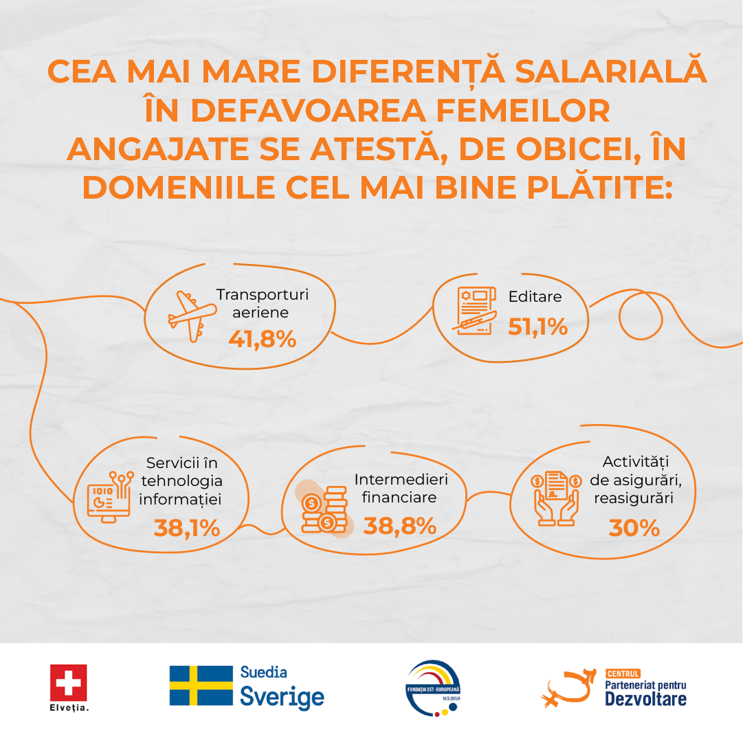 Analiza diferențelor salariale pe sectoare indică o tendință specifică: în sectoarele bine plătite (unde salariul mediu depășește pragul de 20 000 MDL), inegalitatea între salariul femeilor și bărbaților crește. Astfel, o femeie pierde anual din cauza diferențelor salariale o sumă de 254 061 MDL în domeniul editării, 223 022 MDL în domeniul IT, circa 180 000 MDL în domeniul transporturilor aeriene ș.a.