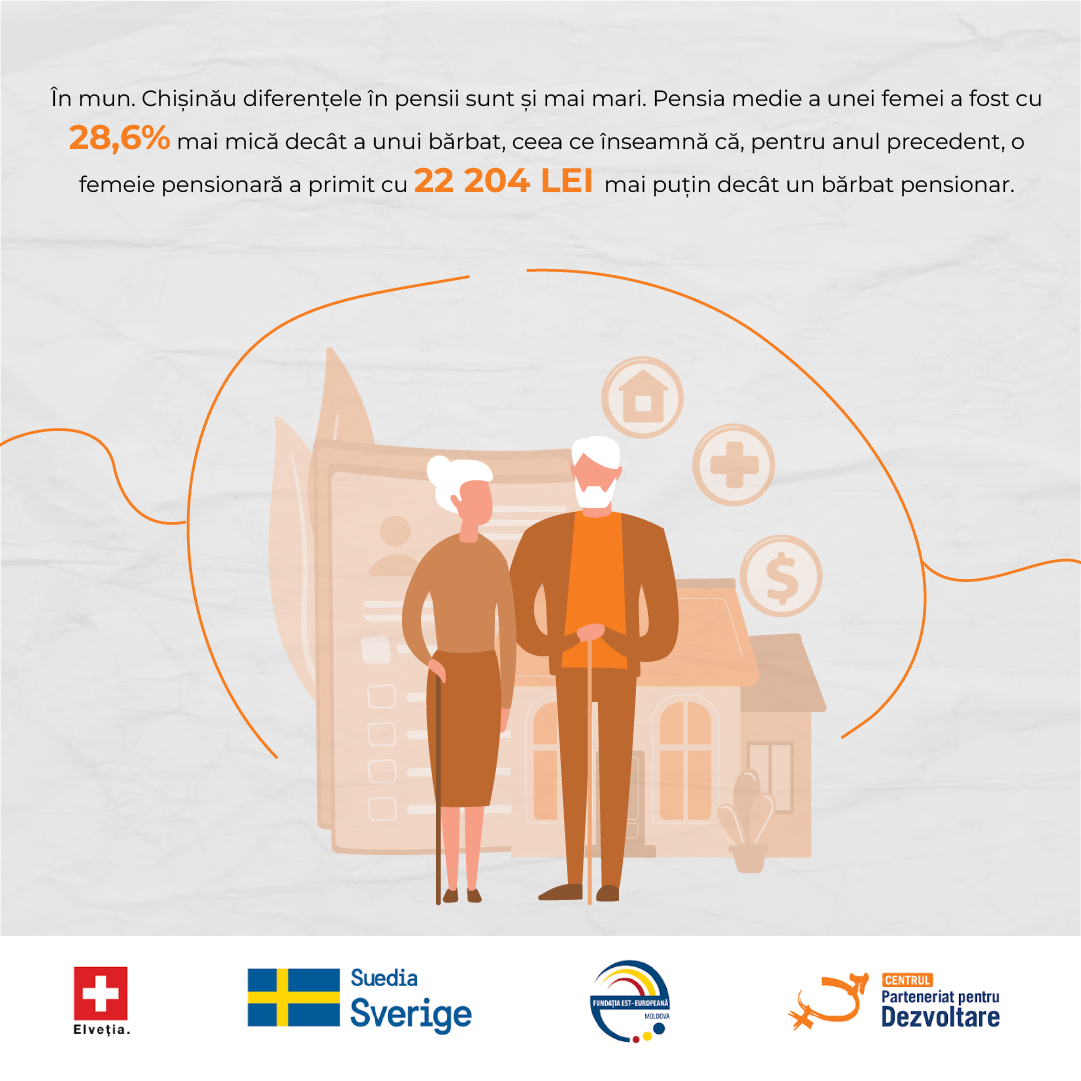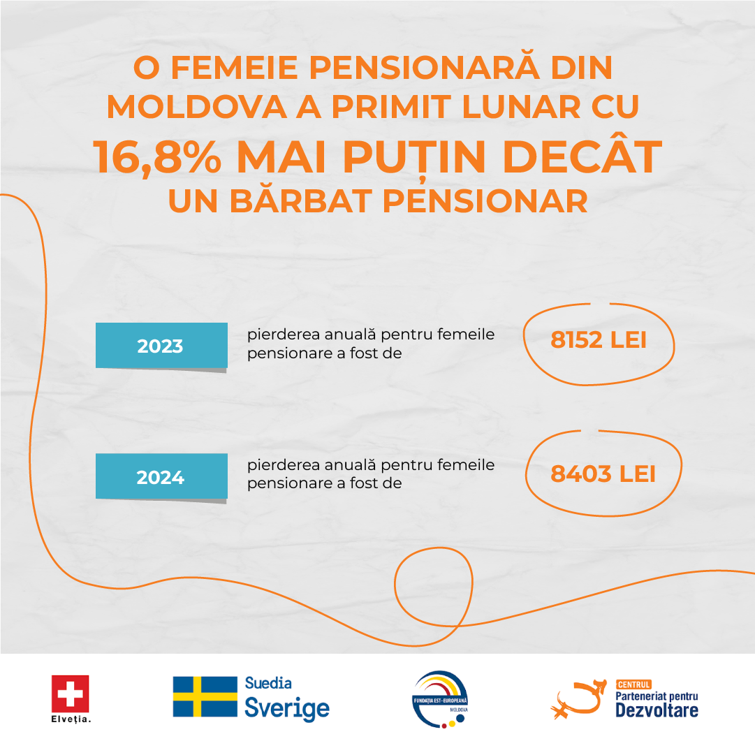 Diferența salarială este asemenea unei taxe invizibile, achitate de femeile angajate în economia Moldovei. Pe termen lung, vedem inechități și la etapa de stabilire a pensiei pentru limită de vârstă. Conform calculelor, în 2024 un bărbat pensionar a ridicat o pensie medie cu 16,8% mai mare decât o femeie pensionară. Deși tendința generală este una pozitivă (o scădere de circa 0,6 puncte procentuale în raport cu anul 2023), diferența respectivă are un impact financiar semnificativ asupra femeilor. În termeni monetari, pentru anul 2024 o femeie pensionară a pierdut în mediu 8403 MDL ca urmare a diferenței în pensii.